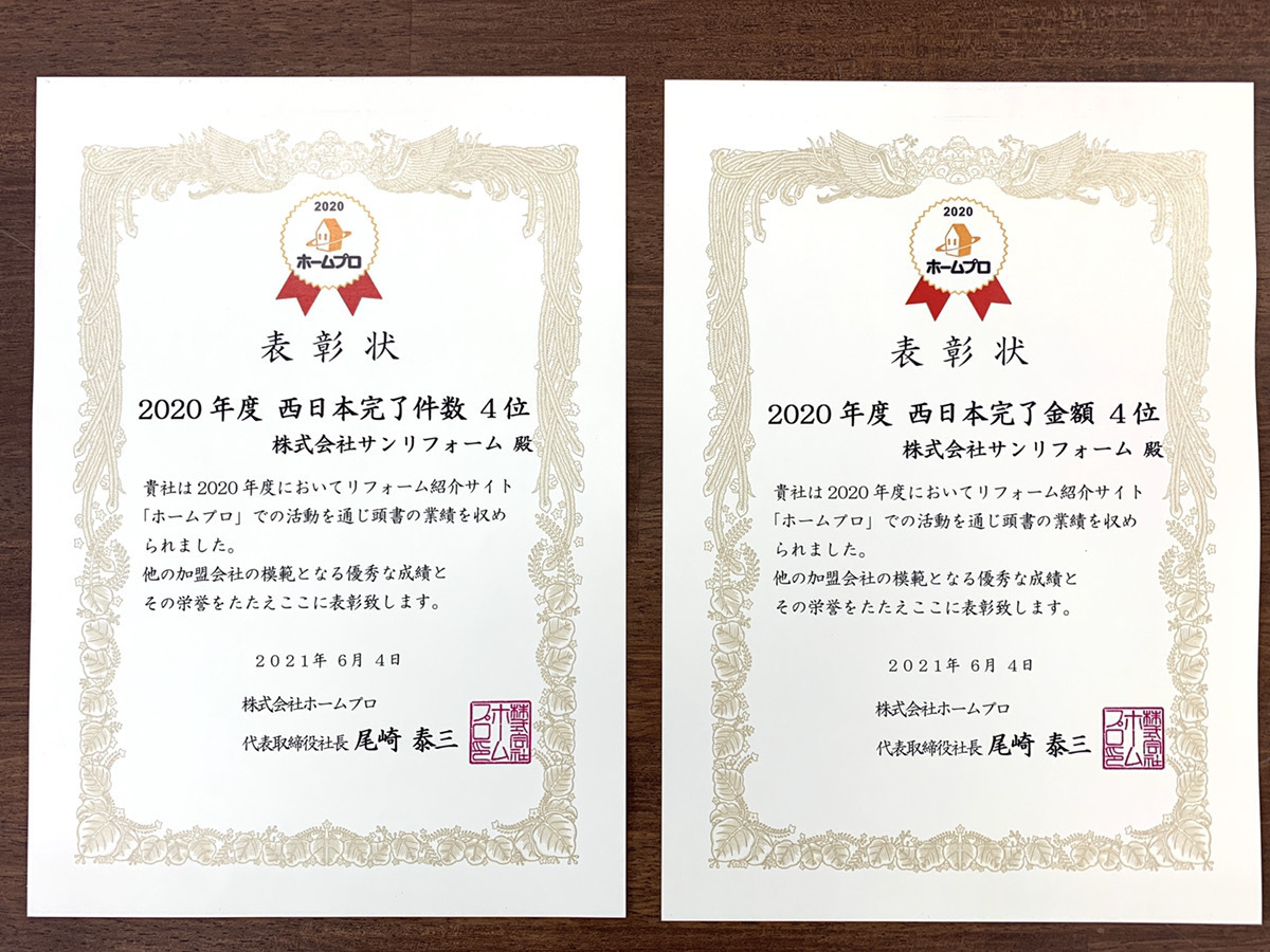 リフォーム紹介サイト『ホームプロ』にて2020年度「西日本完了件数4位」「西日本完了金額4位」を受賞