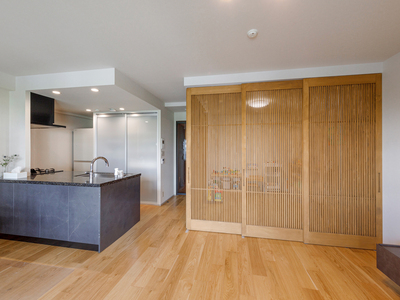 キッチンはシンク下の扉部分をお部屋の雰囲気にあうように替えただけで工夫し、コストダウンにつながっています。