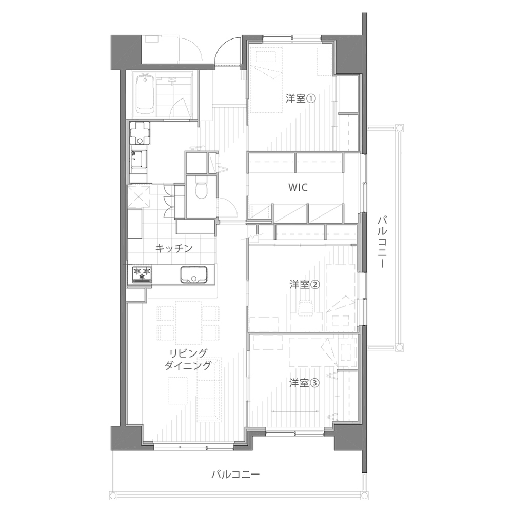 新築時からお住まいのマンションは、生活品のストックや衣類、趣味の物が、いろいろなところに収納され、うまく整理できないお悩みをお持ちでした。家具が置きづらいキッチンも使いづらく、お住まい全体を見直すことにされたH様。それぞれの個室にはたっぷりと収納を設け、リビングは壁一面に壁面収納を設置。キッチン全体をオープンパントリーとして活用することで収納力も使い勝手もUP、快適に暮らせる住まいになりました。