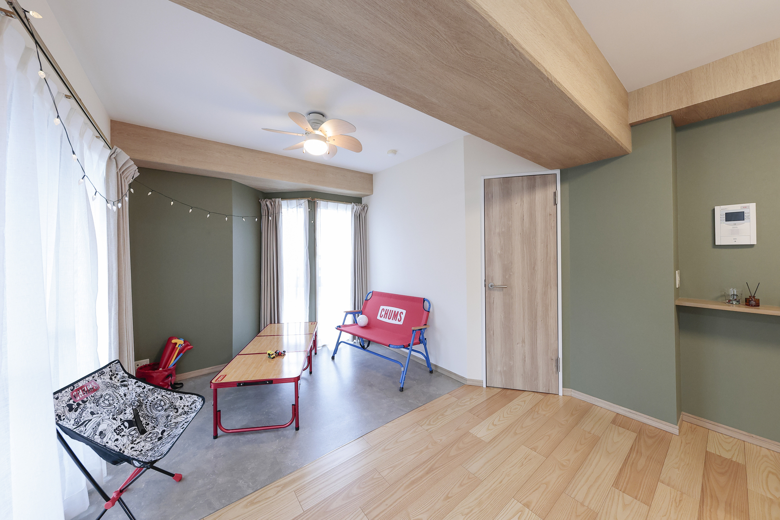 和室をインナーテラスに、押入れをウォークインクローゼットにして収納を拡大。リビングにプロジェクターの設置など、お家の中でもキャンプを楽しめる素敵なお家になりました。