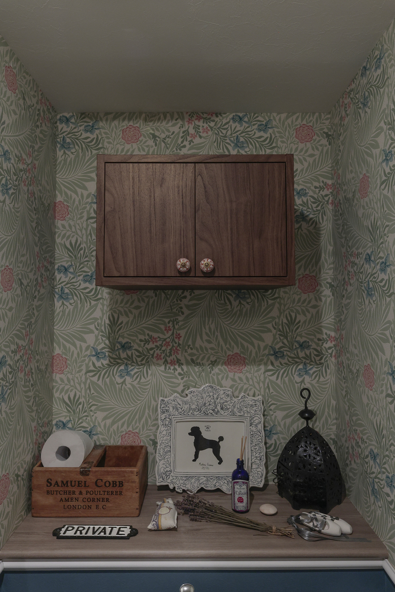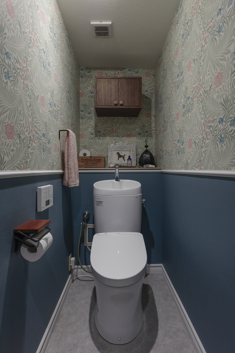 - トイレはマイワールドにしたくて、森の中にいるような雰囲気でウィリアムモリスの壁紙を使用しました。