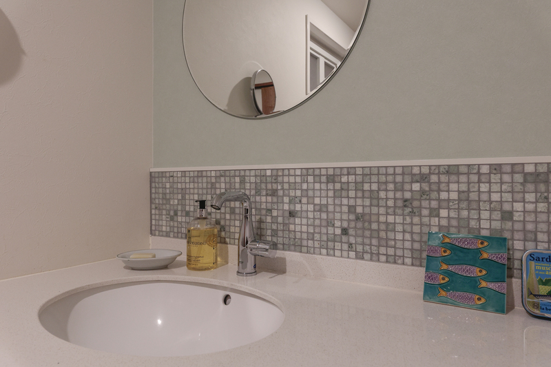 - 壁紙の色にこだわりました。リビングよりグリーン寄りの色にしています。洗面台はキッチンカウンターの素材が気に入ったのでハンセムで同じ素材で作ってもらいまいした。