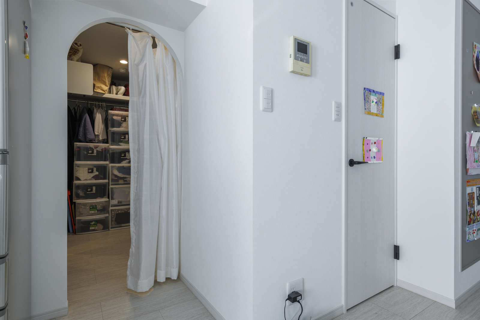 リビングから個室へ続くアプローチはウォークスルークローゼットになっており、ご家族の衣服などをまとめて収納しています。