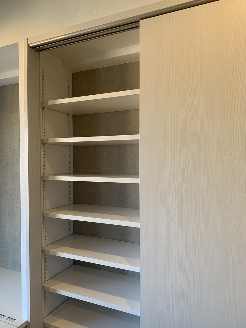 キッチンやダイニングで使用する小物や、その隣に作られたワークスペースの荷物などを収納するスペースとなっています。
