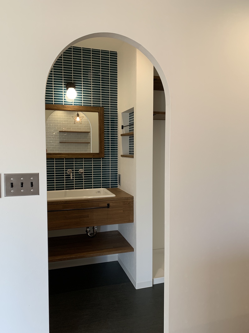 あえて扉を付けず、こだわりの造作洗面台がリビングから見えるように。